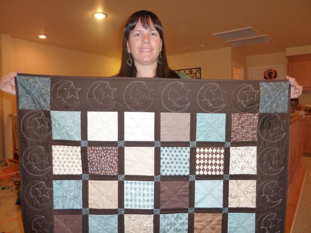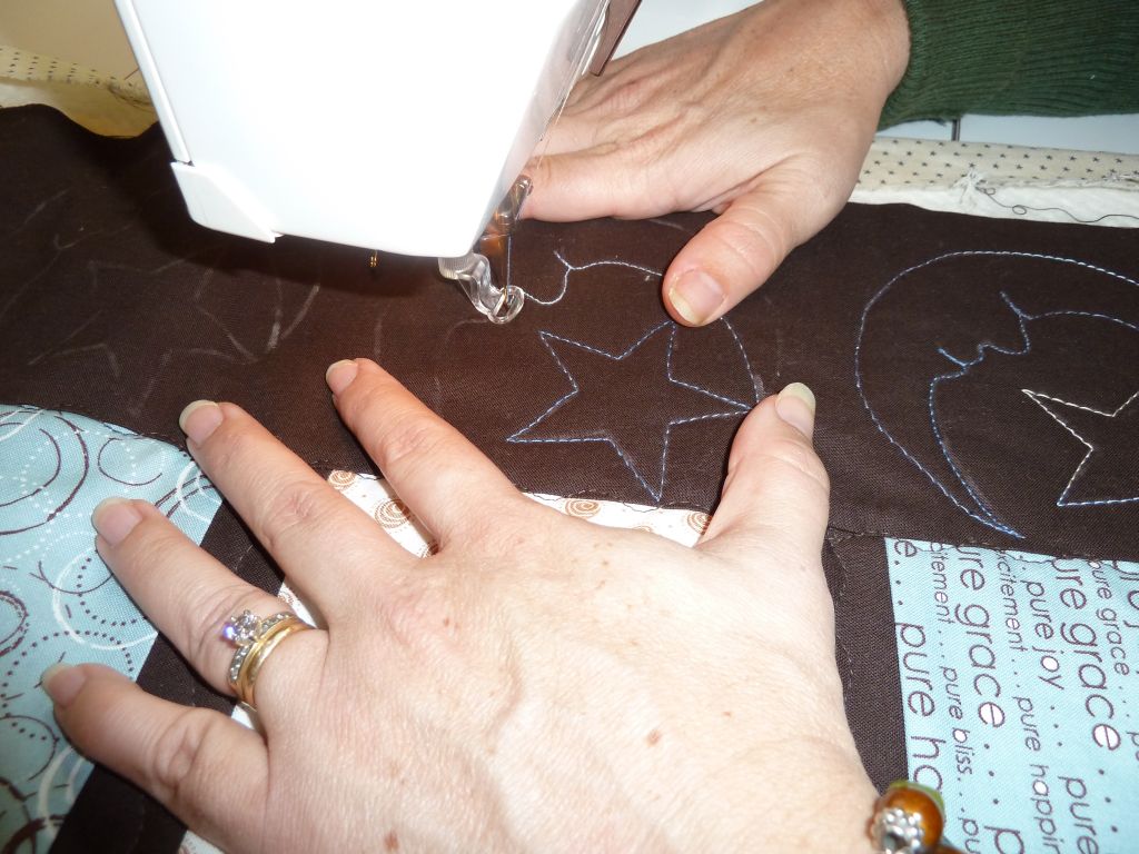 For this quilt I selected a stencil of a moon with a star. It’s really easy to mark and quilt and I’ve used it many times before. I figured out how many moons I’d need to mark around the borders. Then I went back over each one to make the lines a little darker and easier to see while quilting.