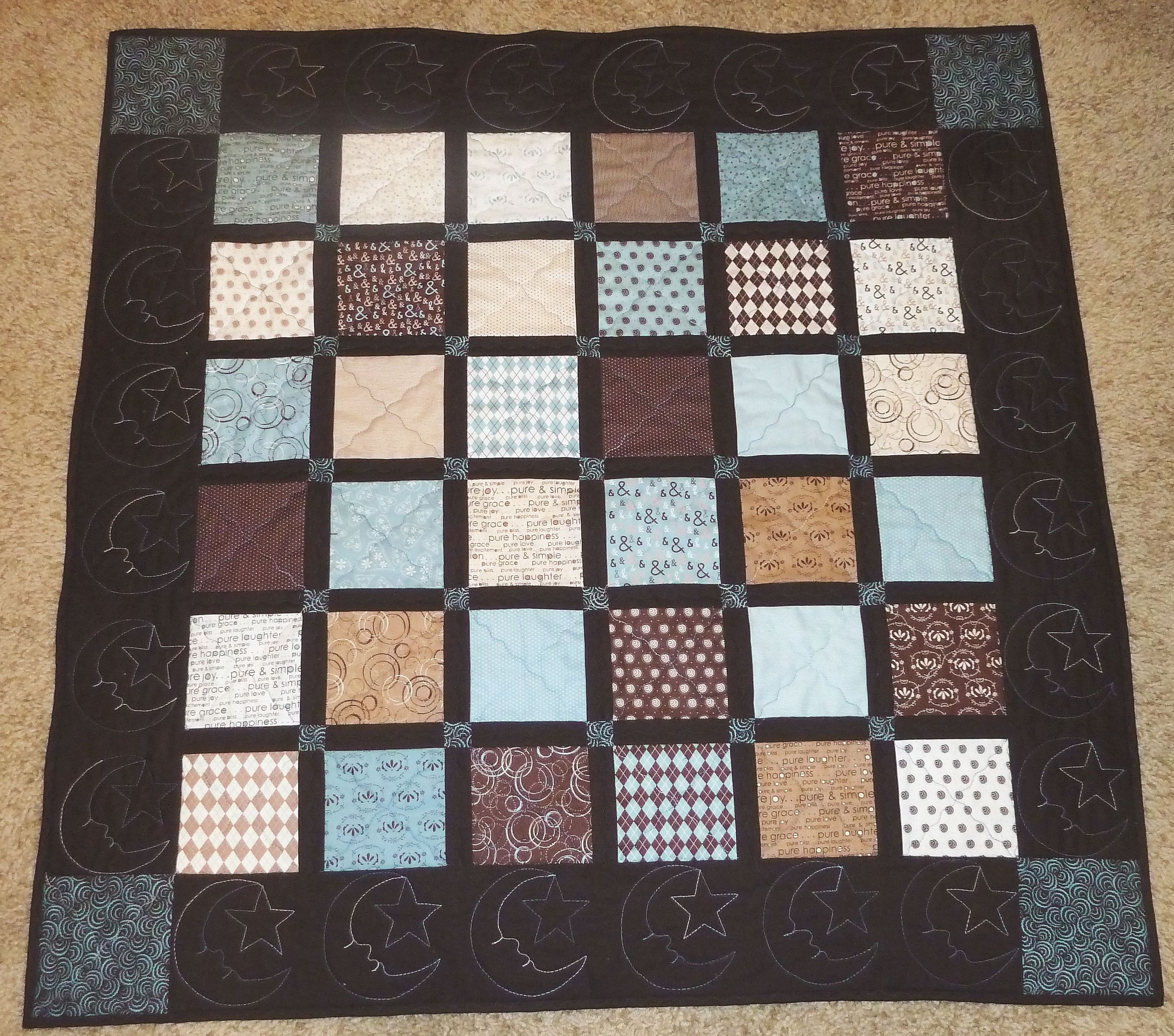 Compared to the fist charm quilt I made, I think I like this one best with the dark brown sashing.