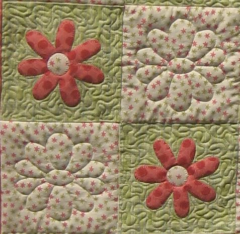 Fusible applique has become my favorite decorative quiltmaking style. I machine stitched around the edges with a buttonhole stitch in a blending thread color. Here’s a closeup of the blocks showing the background stippling:
