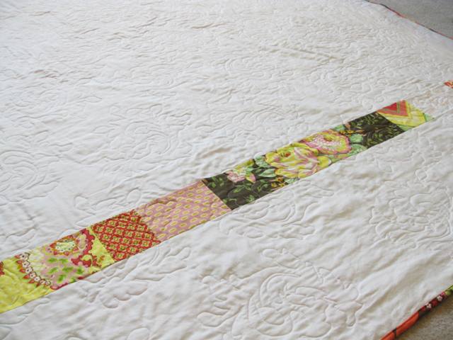 For the quilting, she made a template from one of the Heather Bailey fabric motifs. She used my favorite method of tracing the design onto the top of the quilt with water soluble ink. The quilting was done using her Bernina embroidery foot with the feed dogs off. Way to improvise, Allison!