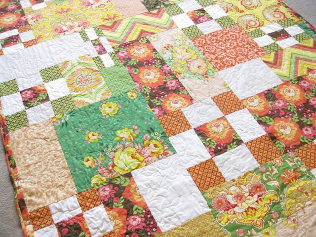 Allison made this quilt from a mix of Heather Bailey prints and Sandi Henderson pieces that she got from me. Don’t they blend well together?