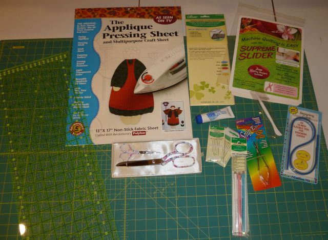 For starters, I got a brand new rotary mat, ruler and some sharp new blades. I also bought a bunch of other stuff I’m going to try like tweezer scissors, water soluble marking pencils, iron-off to clean my iron of any fusible residue and an applique pressing sheet to keep my work clean. If I like these notions, I’ll think about carrying them in my shop!
