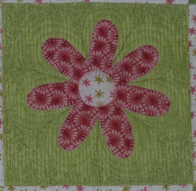 The pictures below show some detail quilting that I added to a quilt I made for a friend last year. I’ll be entering it in my guild’s quilt show next month and wanted to jazz it up a bit. The silk thread really shines!