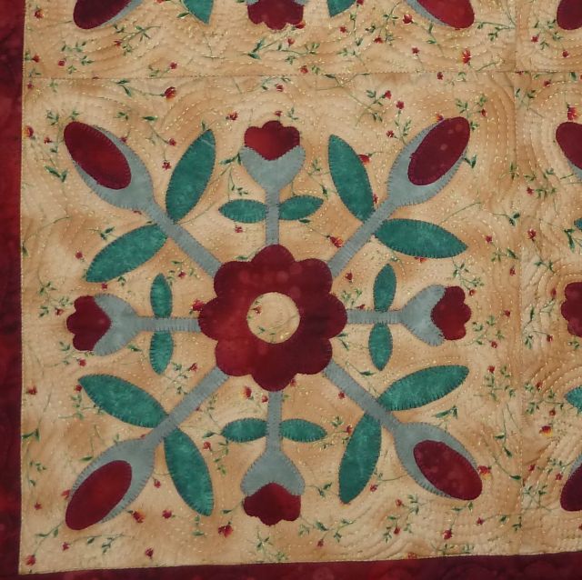 I stayed up late last night adding more quilting to an applique wallhanging I made for my friend in Nebraska (see my earlier December post about our crafty exchange). I decided I wanted to enter it as the final quilt for my quilt show next weekend but it needed a little more quilting before I considered it “show quality”.