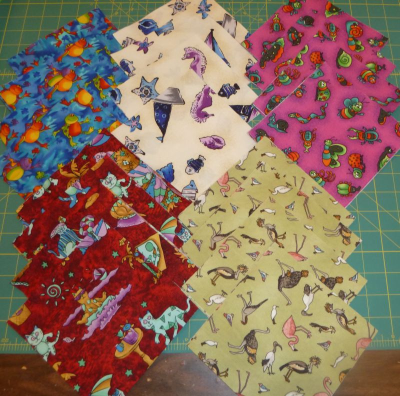 Another thing we do regularly is exchange quilt blocks and fabric. Yesterday we had a novelty charm square exchange. Each person brought in 5 different 6 inch squares of “Eye Spy” fabric for each of 16 people that signed up for the swap. Here are the fabrics I chose. Don’t they look nice all cut up into tidy squares?