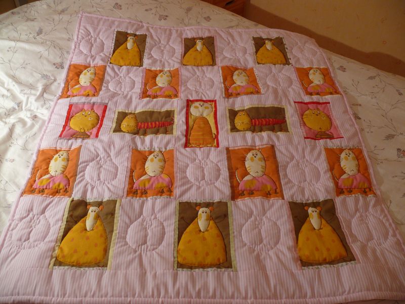 Next, take a look at her adorable cat and mouse crib quilt in pink for a little girl. Can you see the quilted cats? I think they are going to get the mice when she’s not looking!