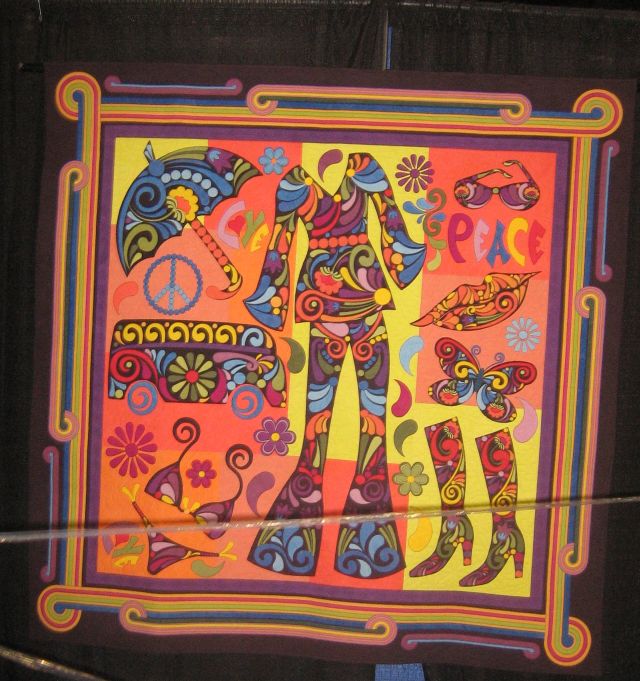 This fun bright quilt is called “American Woman”, made by Jo Ann Blade & Kim Diamond of Sedro Woolley, Washington. I think it’s simply fantastic. During the quilt show, there was a vendor selling bright “quilty” shoes similar to those depicted in this quilt!