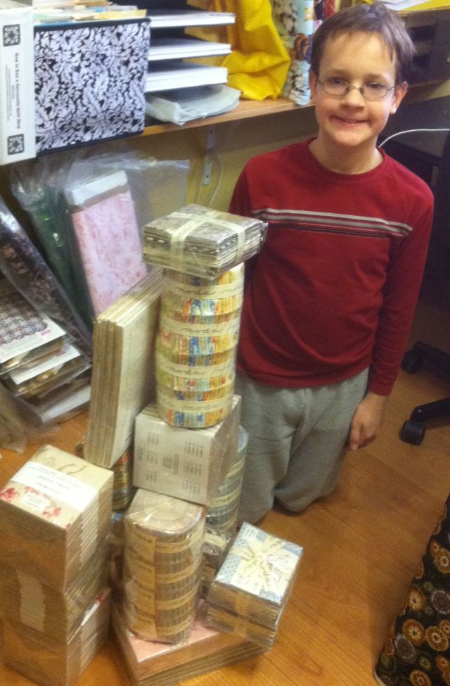I just had to share this cute picture with you. It’s my younger son’s job to help me unload boxes whenever I get in a new fabric delivery. He likes to make it fun by building towers out of all the Moda bundles that arrive. At least you know your precuts are in good hands!