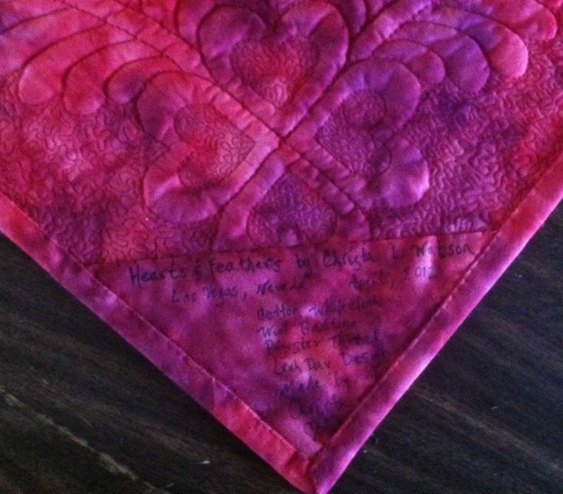 After I finished my Hearts & Feather wholecloth quilt, I wanted a simple way to add a label and hanging tabs so I used the folded square method that’s been gaining popularity lately. Here’s a picture of the back of my quilt, before adding the binding: