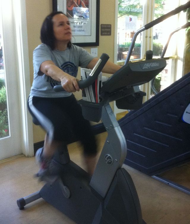 It helps to workout with friends and I exercise each day with a group of gals that live close by. We are lucky enough to have a clubhouse in our neighborhood complete with a fitness center and swimming pool. We like to start off with a bit of cardio each day (biking, running, stairmaster, etc.) and then do some strength training. By getting out first thing in the morning we can enjoy each other’s company and get ready to take on the day. It’s amazing how fast an hour can go!