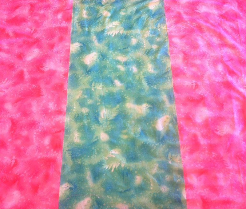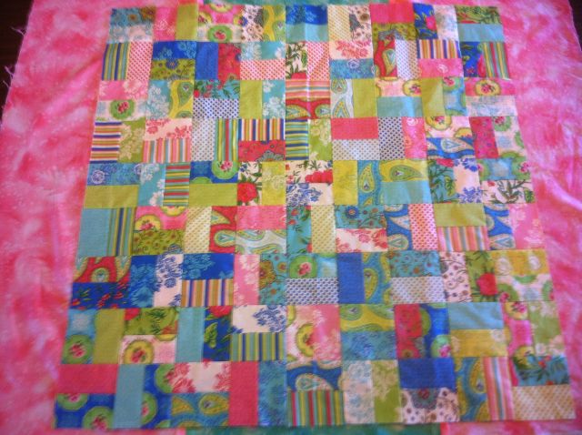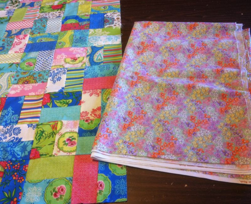 I like the pink and green fabrics much better. However, there’s not enough of either one, so the next step will be to sew the pieces together to make a large enough backing.