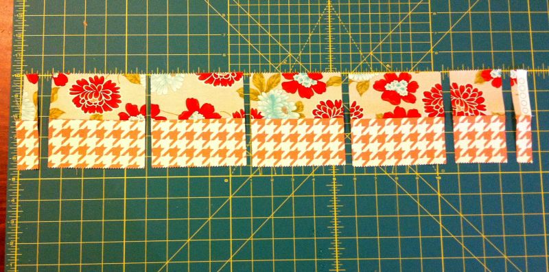 Step 2 – Group your half-strips into pairs. You’ll be using the same fabric twice each time, so try to mix them up so they are all different. Or you can sew them together totally randomly. Lay your whole stack next to your sewing machine, with pairs rights sides together and sew them together along the length. Try to keep a consistent quarter-inch seam allowance while sewing.