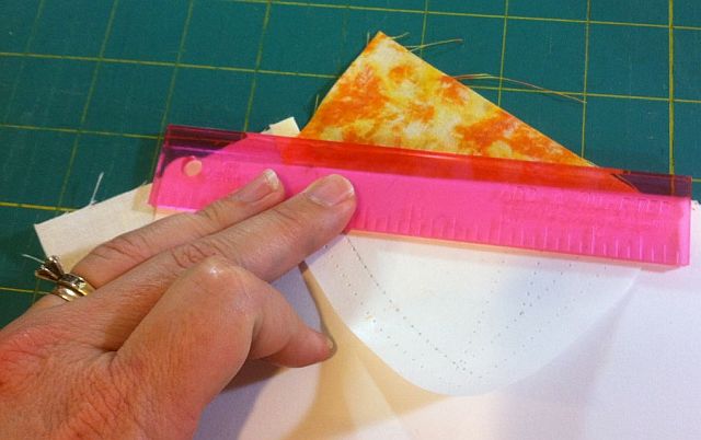 Long RulerI recently starting using a small ruler, called “add a quarter” when paper piecing. I took a class from awesome teacher and author Gail Garber. You can read my blog post about that.