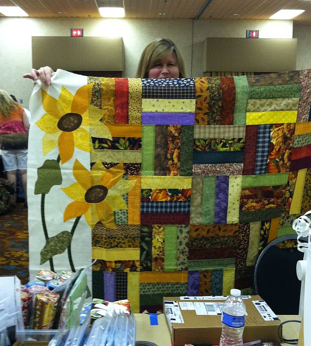 Busy Hands QuiltIt’s been super fun giving spontaneous quilting demos to whomever walks by and I am feeling very productive. I finished all of the straight line quilting on Baby Bricks and now all I have left to do is the binding. Whoo hoo!