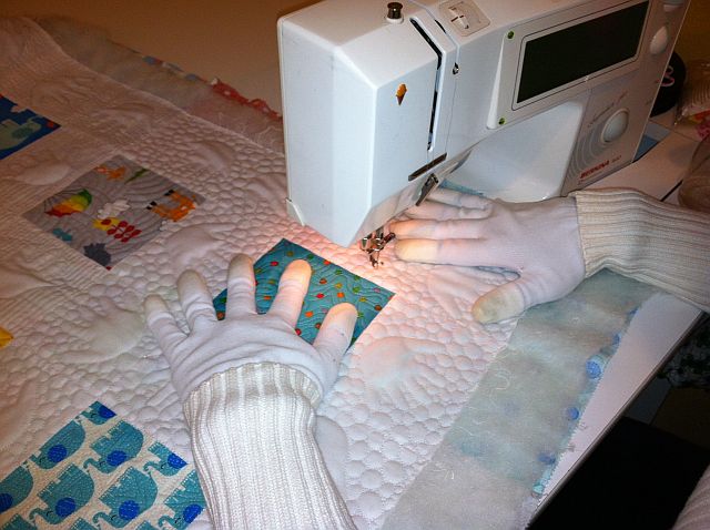 The hardest thing to deal with when quilting is the drag on the quilt. I have drop-in table and also use a Free-Motion Slider whenever doing FMQ (free-motion quilting). However, the quilt gloves give that little bit of extra friction that is needed while pushing and shoving my quilt around underneath the needle.