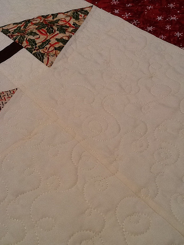 Today I especially wanted to give a shout out to a few gals who have already begun machine quilting their quilts. I’ll start off with Susan from Desertsky Quilting. She whipped up 4 blocks into this cute quickie table runner. She stitched a simple outline around her trees which shows up wonderfully on the back in the photo below: