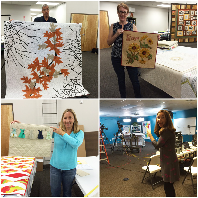 This past weekend, I flew to Handi Quilter headquarters in Salt Lake City to film 3 video segments for QNNtv.com. I’ll be a guest on Quilt It – The Longarm Quilting Show, coming up next spring. Although I am NOT a long-arm quilter, I was able to share tips and tricks for free-motion quilting using the sit-down Sweet 16 machine. In addition to talking about many of the machine quilting designs from my book, I was able to let the viewers in on some other fun surprises, including details of the quilt right behind me. (Don’t worry – I’ll spill the beans on that one soon….)