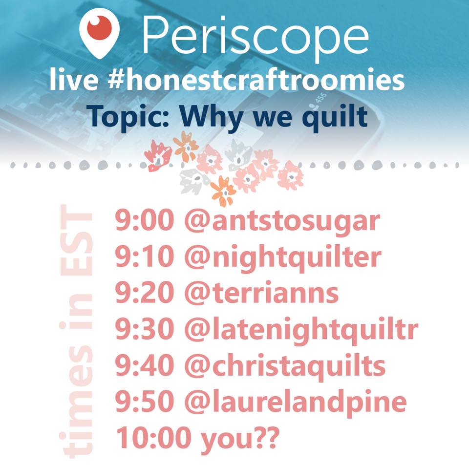 I just joined the latest social media craze – periscope!! Now I have to be honest and tell you I don’t really know much about it, except that it’s fun! You can follow me there by downloading the Periscope App on your smart phone and finding me under ChristaQuilts.