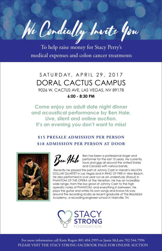 If you live near the Las Vegas area, there will also be a benefit this Saturday night, featuring the music of local performer Ben Hale. Tickets are $15 in advance or $18 at the door and all proceeds will benefit Stacy and her family. To purchase tickets (or make a donation if you are unable to attend), go to PayPal, click on family and friends option and use the email address: stacystrongfoundation@gmail.com.