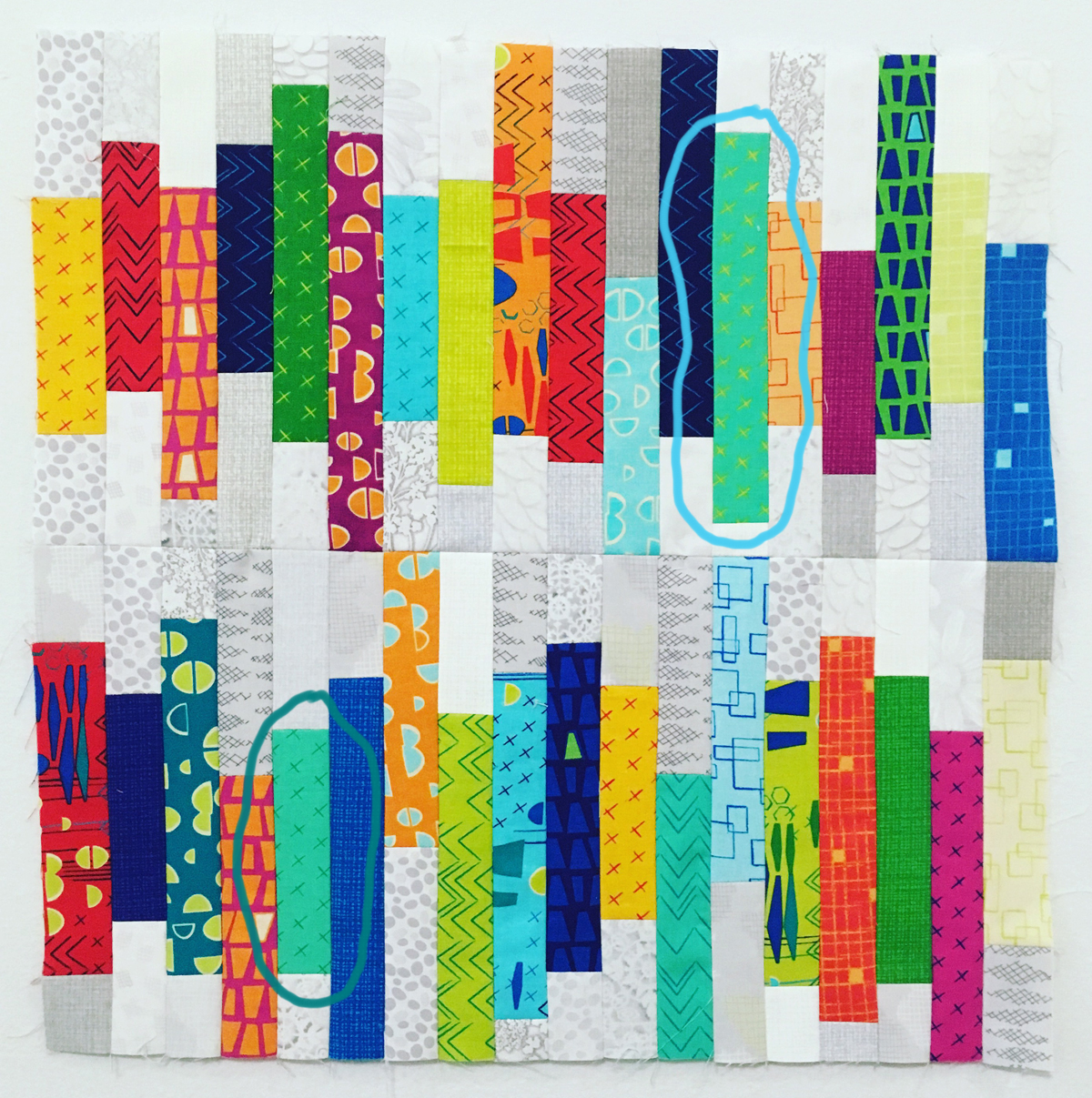 Instead we changed it to be dark turquoise x’s instead of lime which worked much better. See the fabric circled in the bottom row below. I still thought it would be fun to use both pieces  in my mini to preserve the history of this fabric collection, and a bit of a story to go with it!