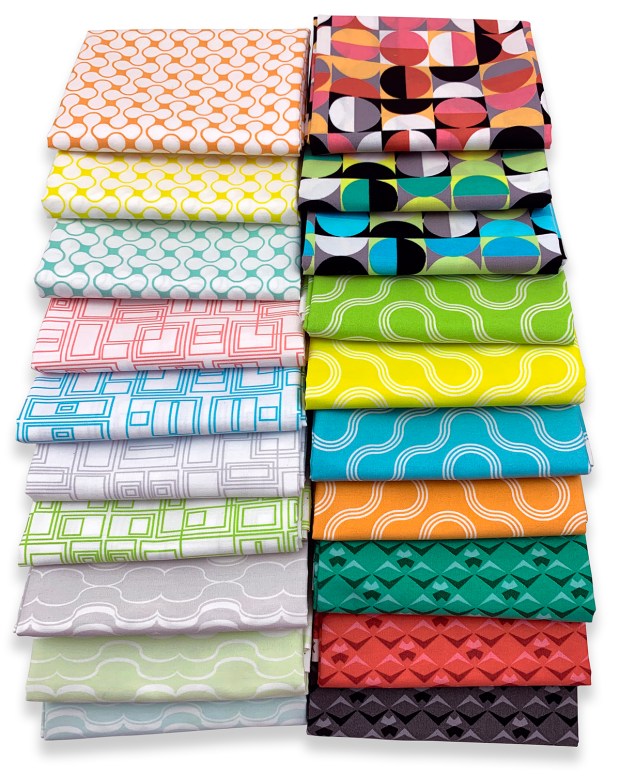 Modern Logs Quilt Along officially kicks off next week on September 2nd, but today I want to take a minute and discuss fabric selection so you’ll be ready to roll when we begin. In a nutshell, you want to use fat quarters that have good contrast between lights and darks. I’m using Good Vibes fat quarters shown below, but nearly anything you can think of will work!