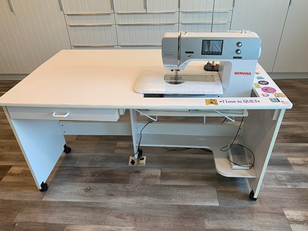 Having a large work surface will help as you scrunch and smoosh your quilt through the machine. My table is about 20 years old and originally held a different machine, so you can see that the hole in the middle doesn’t really fit my new machine. However, by placing the extension bed on top of it and adjusting the height of the drop in table, it works great!!