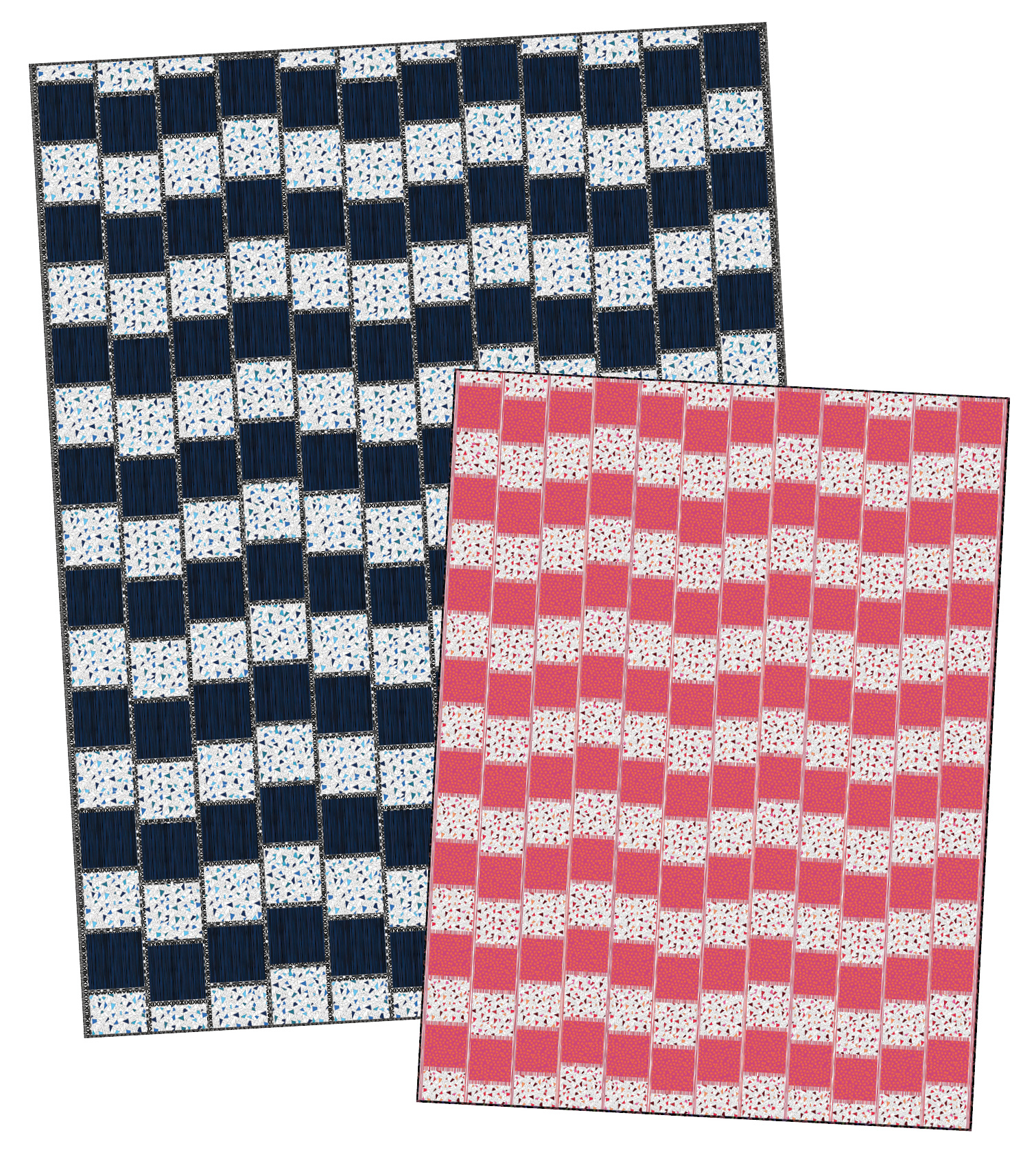Be sure to scroll up and down to see these quilts wiggle. That’s the optical illusion caused by the placement of light, medium and dark fabrics in the correct proportion. The secret is to have high contrast in the squares (the lightest and darkest prints) with a medium/midtone color as the long skinny strips in between.