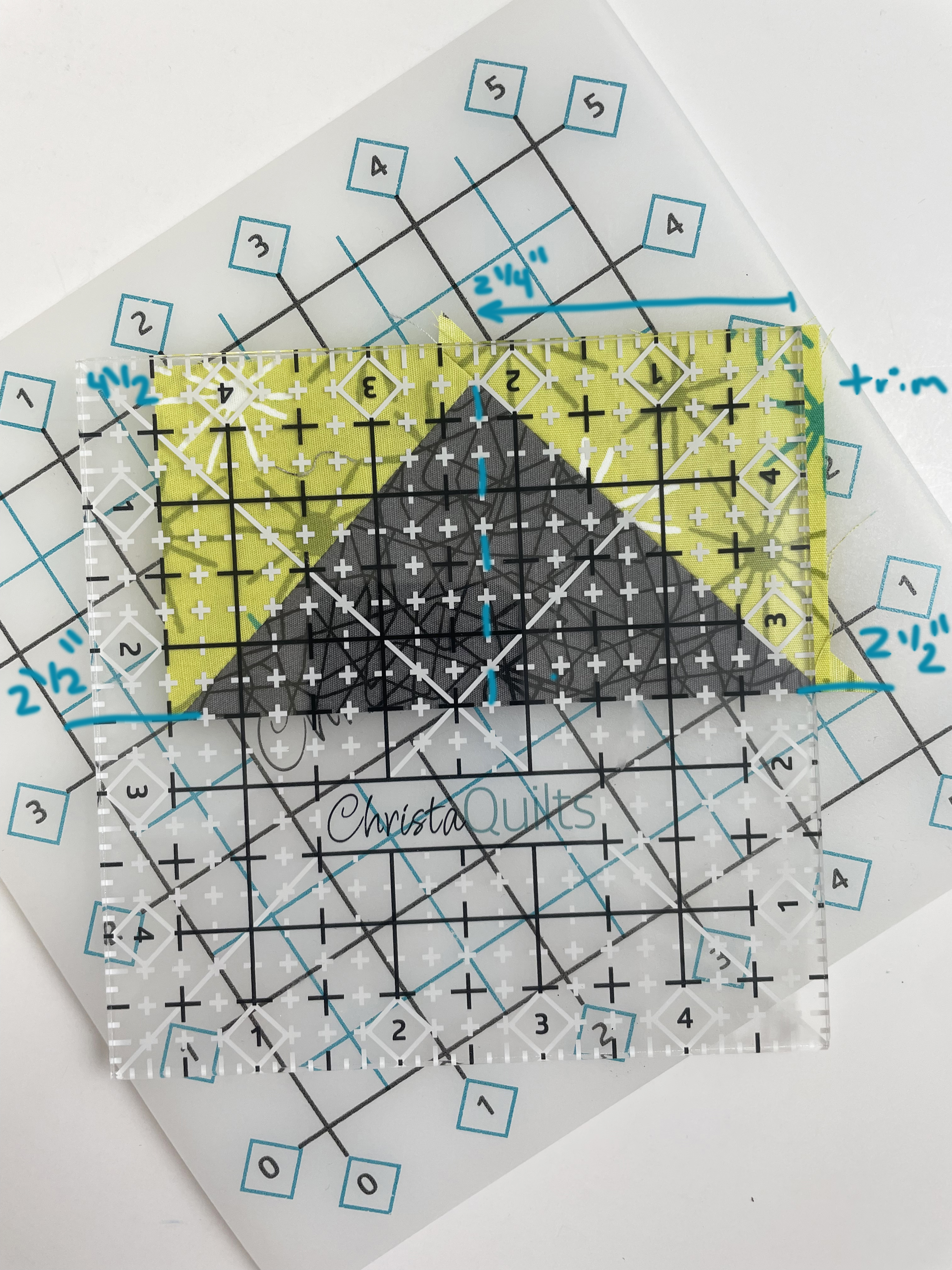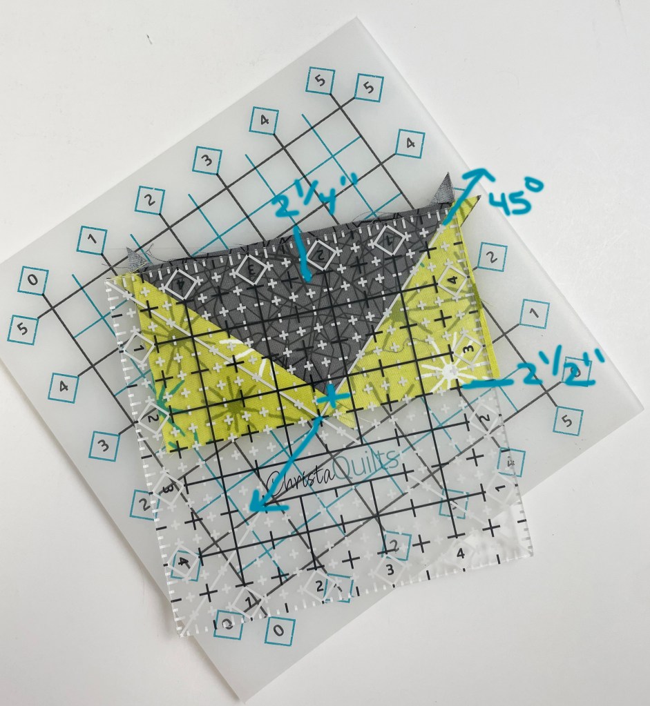 From the right, measure halfway across the unit which in this instance is 2 ¼”. Line up the 45 degree diagonal line on the ruler with the right diagonal seam. The little blue plus that I’ve marked should be the intersection of the dark triangle tip and the diagonal line. The bottom of the geese unit should hit right on the 2 ½” line.