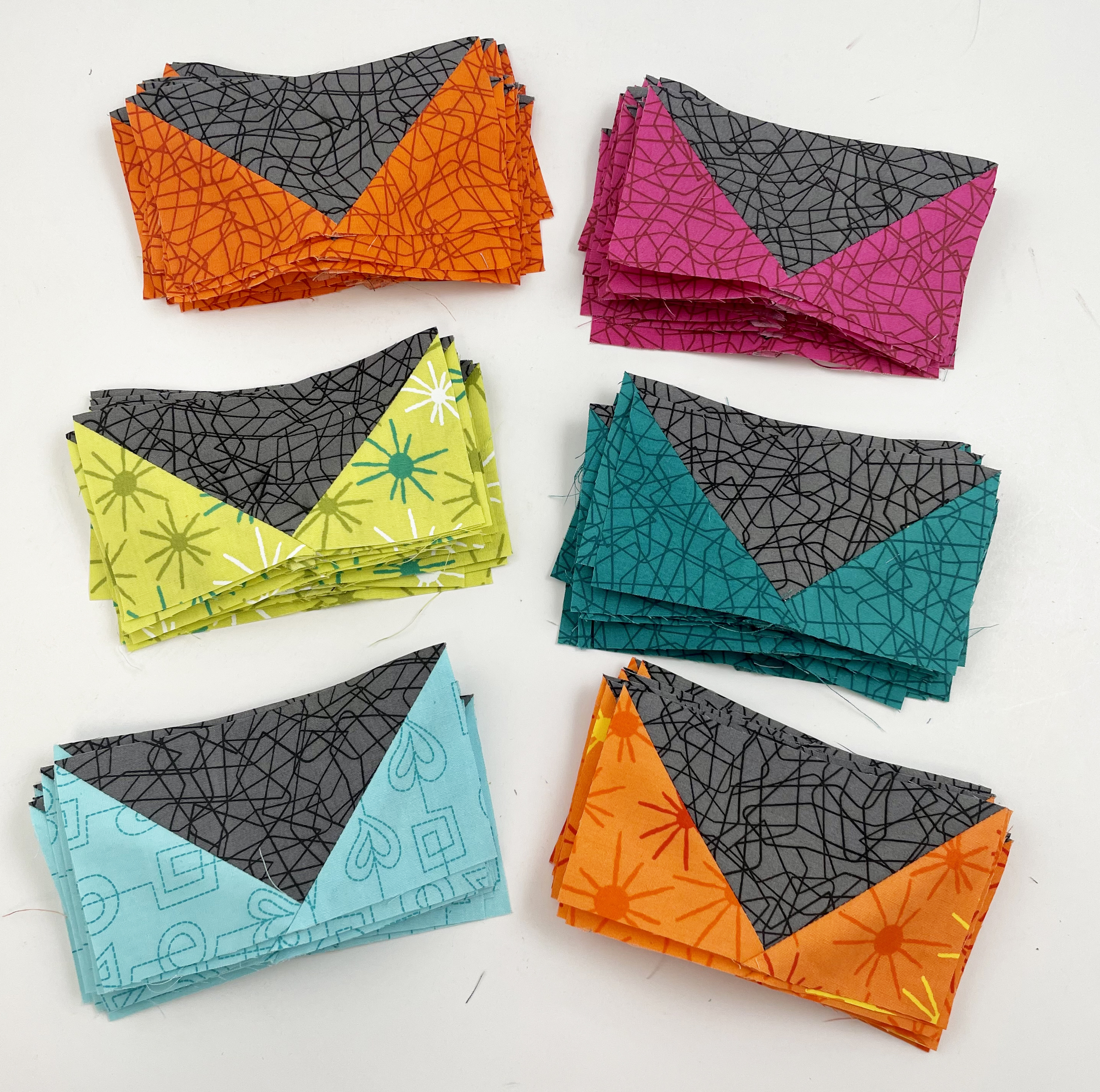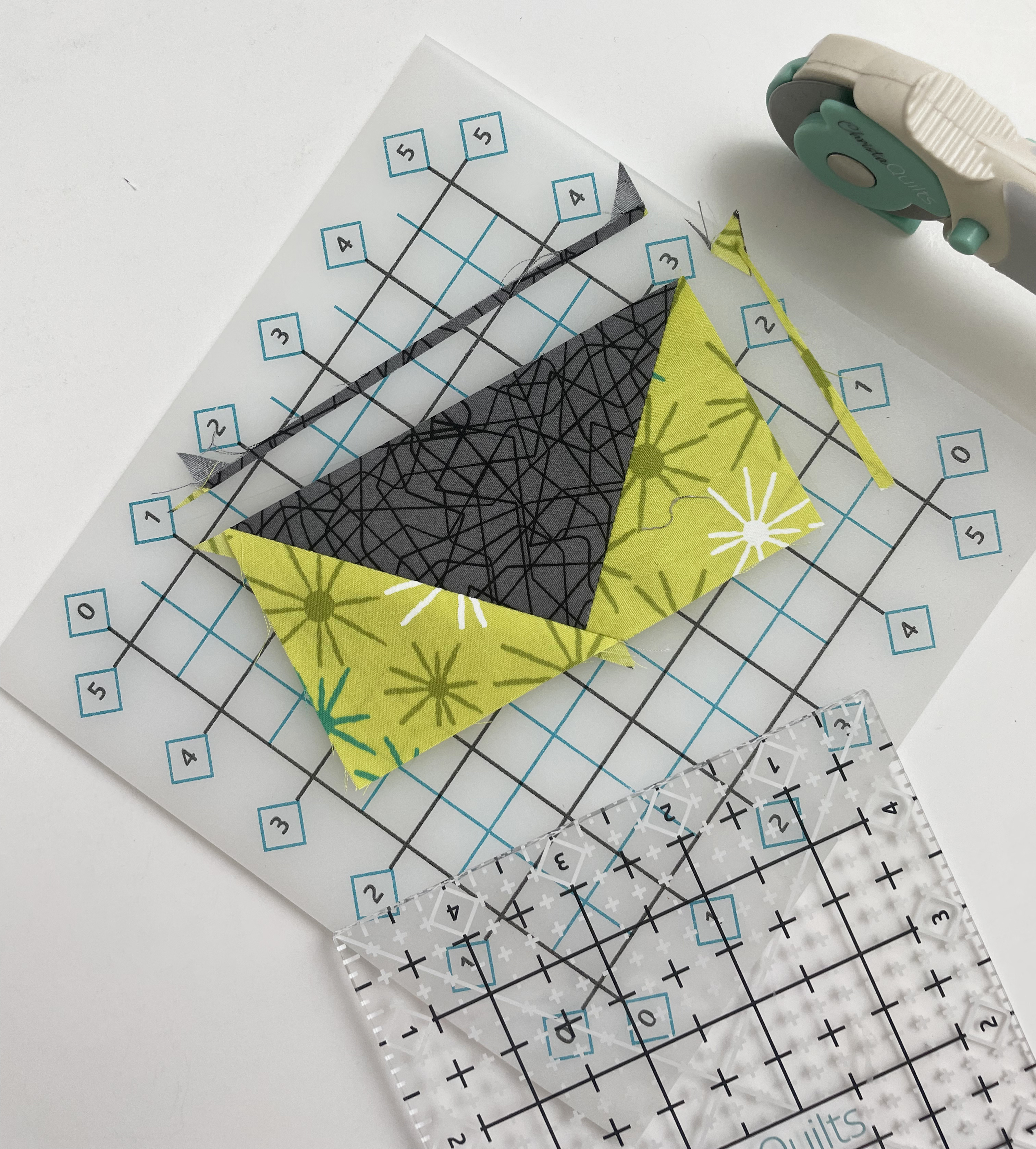 Rather than purchasing a specialty ruler just for flying geese, I’m trimming these up with my new Mini Mat and Ruler Set, which is perfect for making smaller cuts while at your machine. This saves me loads of time since I don’t have to get up and move to my larger cutting table.