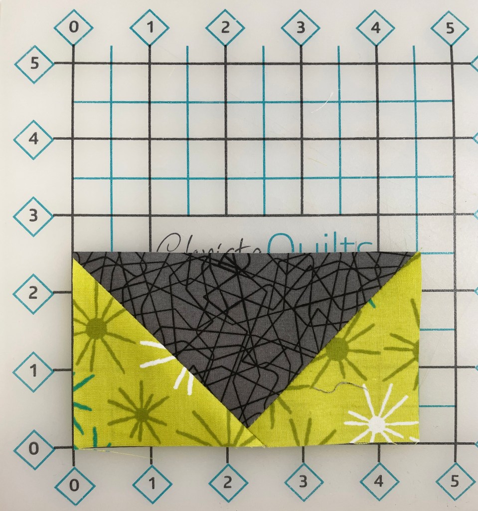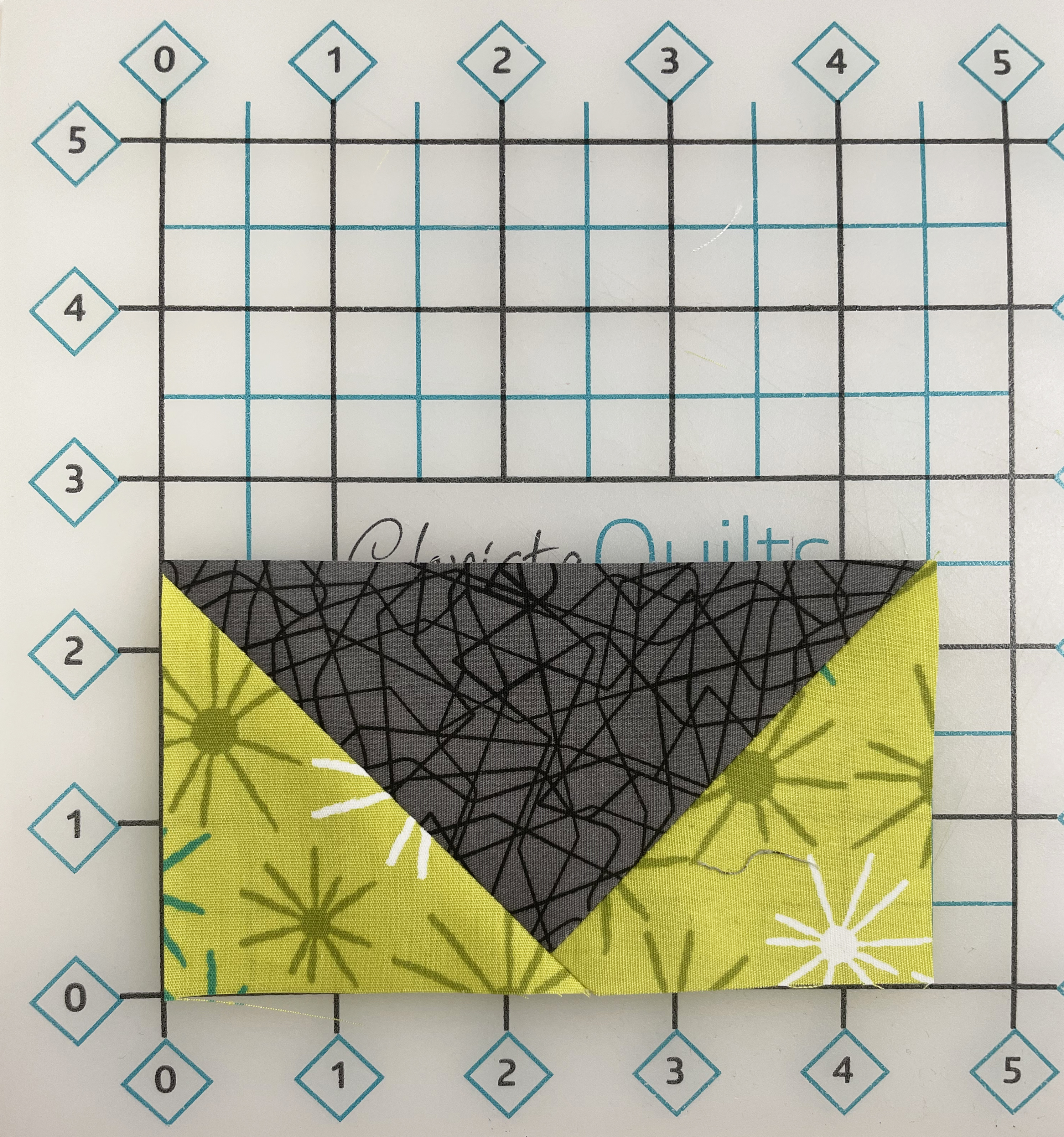 First you need to know the unfinished size of the units you are working with. These units are 2 1/2″ x 4 1/2″ unfinished. When sewn together the finished size will be 2″ x 4″ because geese are twice as wide as they are tall.