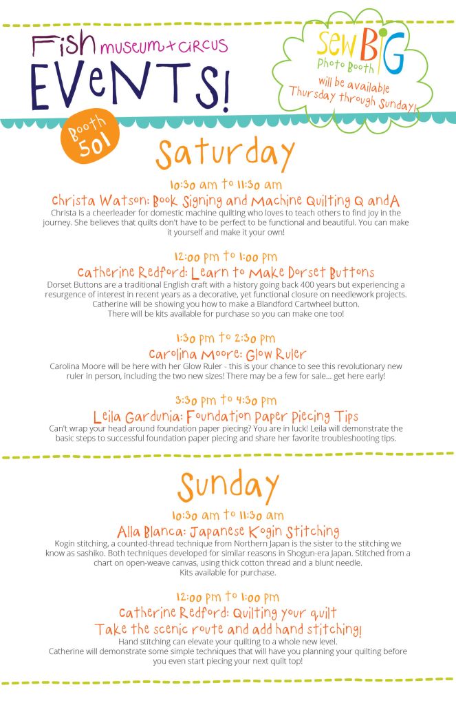 Just after my first lecture on Saturday morning, I’ll be heading over to my new friend Deborah’s booth #501: Fish Museum and Circus from 10:30-11:30 AM. She’s known for her whimsical ceramic pincushions which always sell out at every show. We met at quilt market last fall and became fast friends!! She’ll host several fun designers events during the show, so that should be lots of fun!!