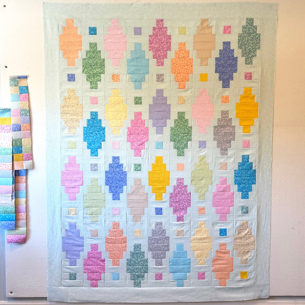 Finally, I add the borders and give the quilt top a final press! Notice the bit of patchwork on the design wall below. I sewed together some leftovers into strip units and I’ll start using those on the back.