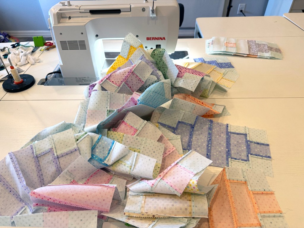 Once that’s done, I’ll make a stack of blocks to sew in order and then chain piece, or assembly line sew them all at once. I always start sewing with a leader/ender piece of scrap fabric to catch my threads. This prevents them from knotting up when I start and stop.