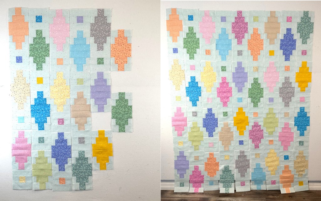 I’ll sew all of the blocks together into rows and then continue using my design wall to lay it out as I join the rows together. I press after every round of sewing to keep things nice and flat.