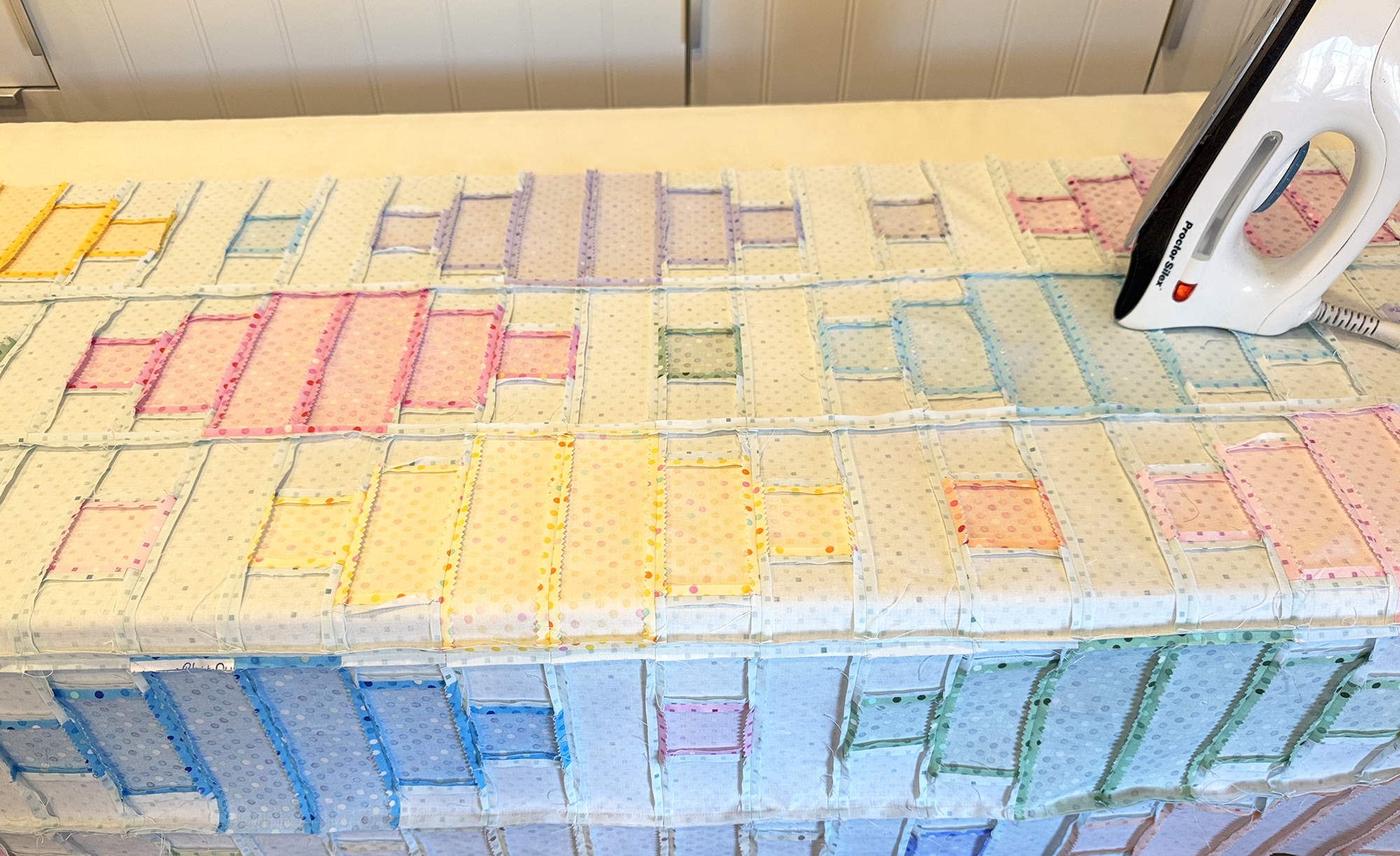 I’ll sew all of the blocks together into rows and then continue using my design wall to lay it out as I join the rows together. I press after every round of sewing to keep things nice and flat.