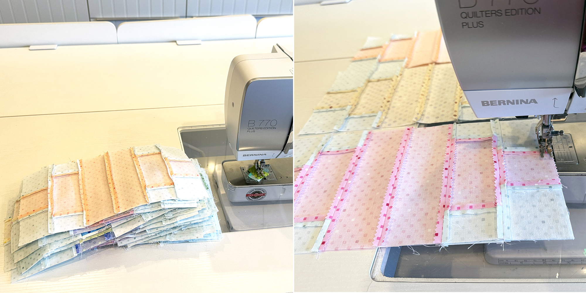 Once that’s done, I’ll make a stack of blocks to sew in order and then chain piece, or assembly line sew them all at once. I always start sewing with a leader/ender piece of scrap fabric to catch my threads. This prevents them from knotting up when I start and stop.