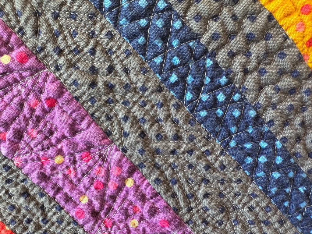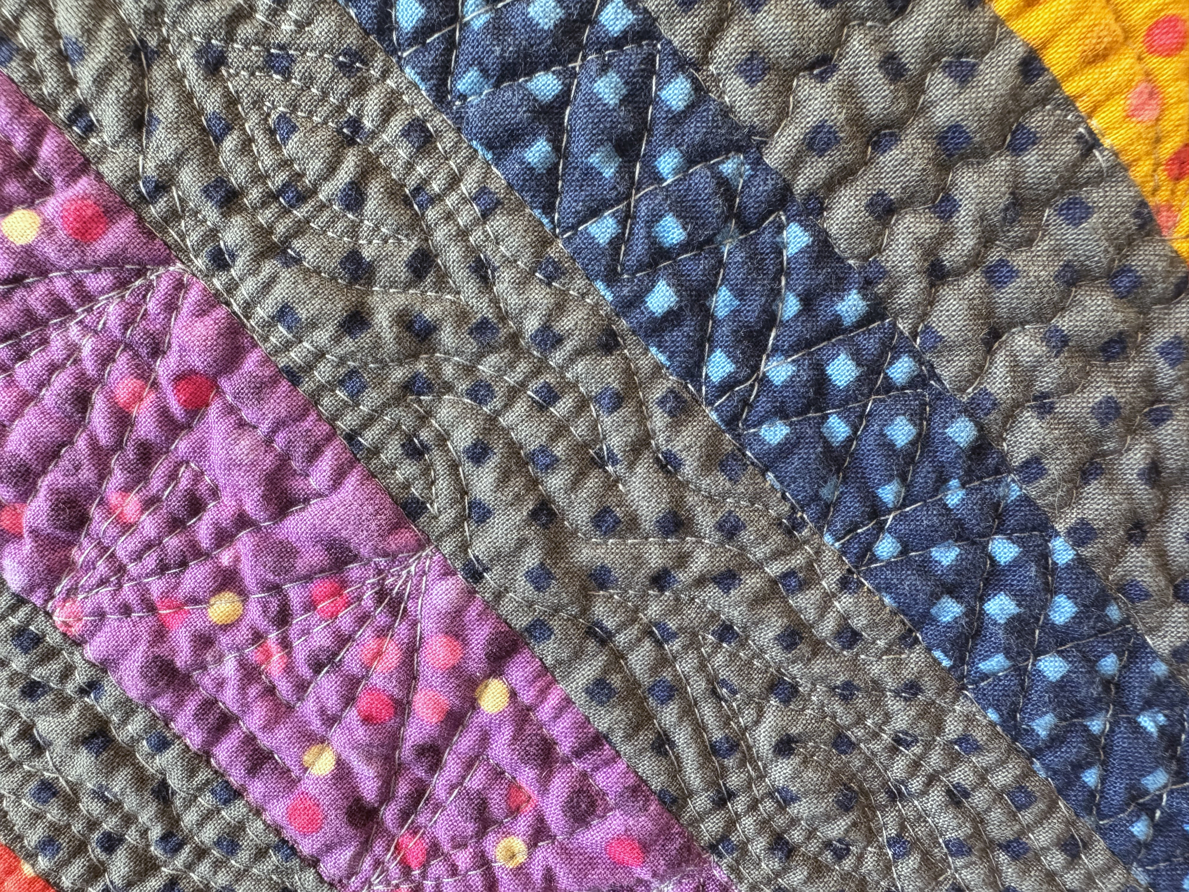 In this detail closeup, you can see where I quilted Squished Spirals. Since I’m using gray thread on gray fabric, the quilting blends right in.