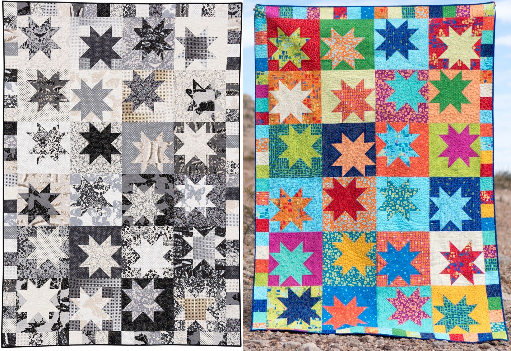 Throughout this series, I’ve loved showing how I quilted these designs on actual, real quilts. The quilt shown in the video behind me is called Star Struck and it’s fun to see how different it looks depending on the fabrics that are chosen. Complete, start to finish instructions for this pattern are included in my book, Piece and Quilt with Precuts!