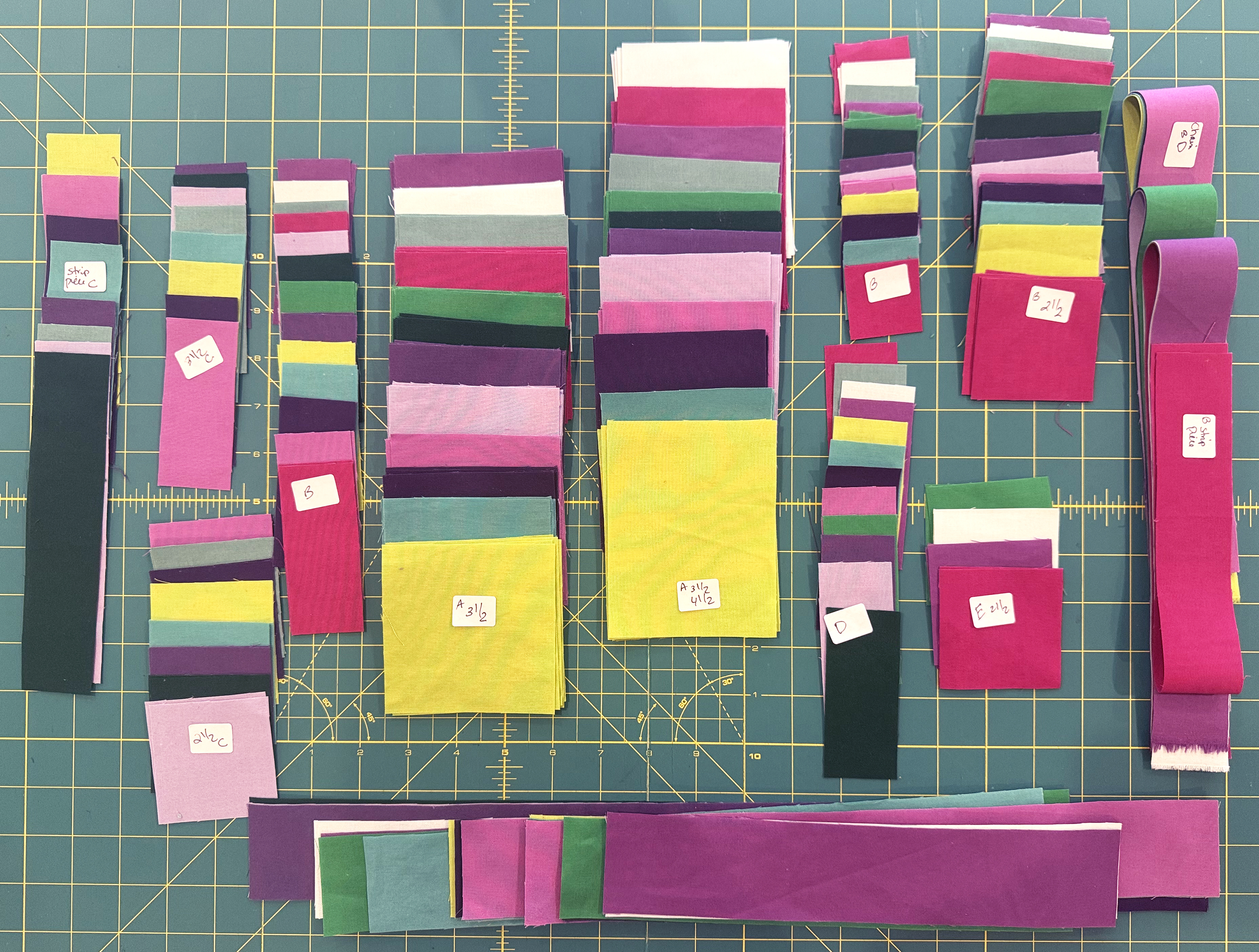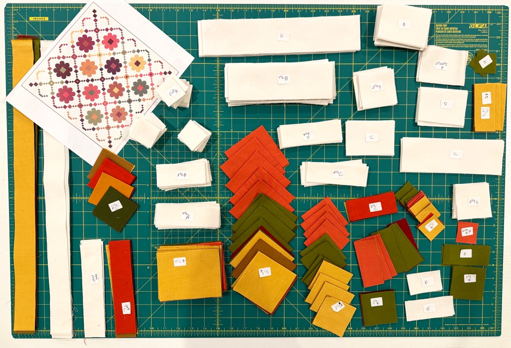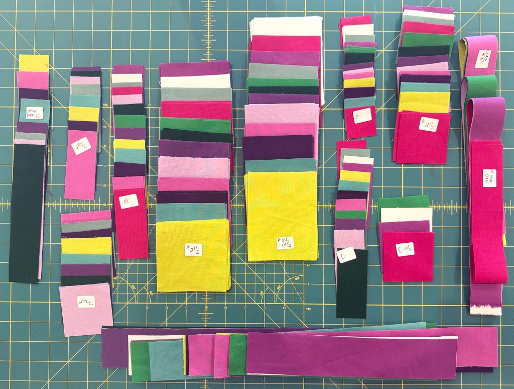 I’m basing the instructions on 42″ wide fabric for the background with 40″ of usable length, and 17″ x 21″ usable area of the fat quarters. I recommend cutting out the fabric for the colorful units first, and then the background. The background goes much quicker since it’s all of one fabric.