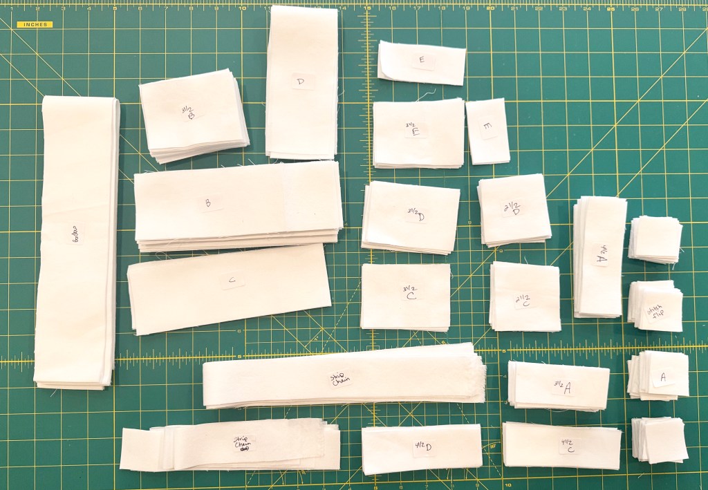 For cutting speed and efficiency, I’ll stack my fabrics up to 4 layers thick and double check my measurements. I like to cut out all of my strips first, and then subcut those into squares and rectangles. Most of the blocks will be made from individually cut units. However, there are a couple of units that can be strip pieced, so follow the cutting charts carefully as indicated.