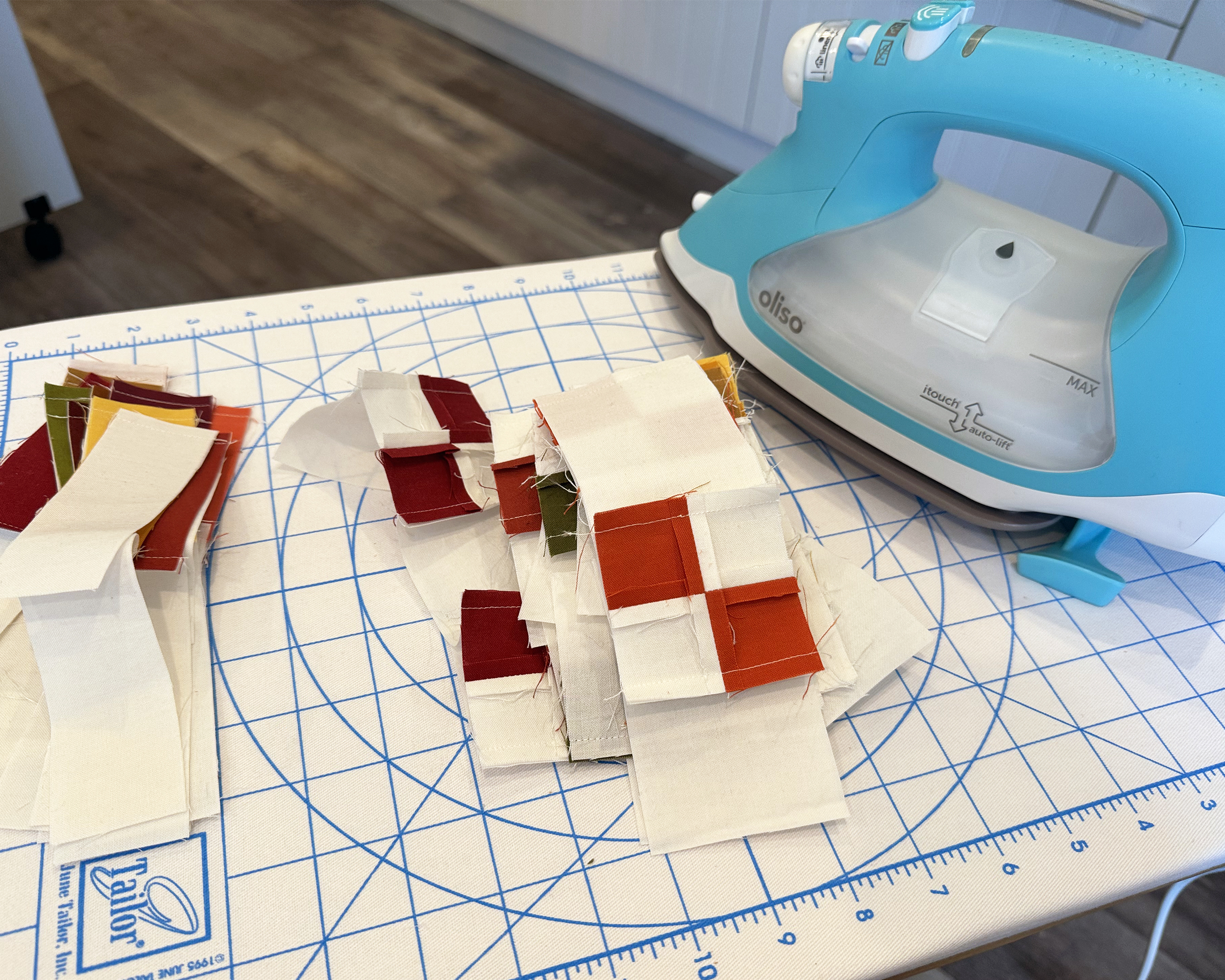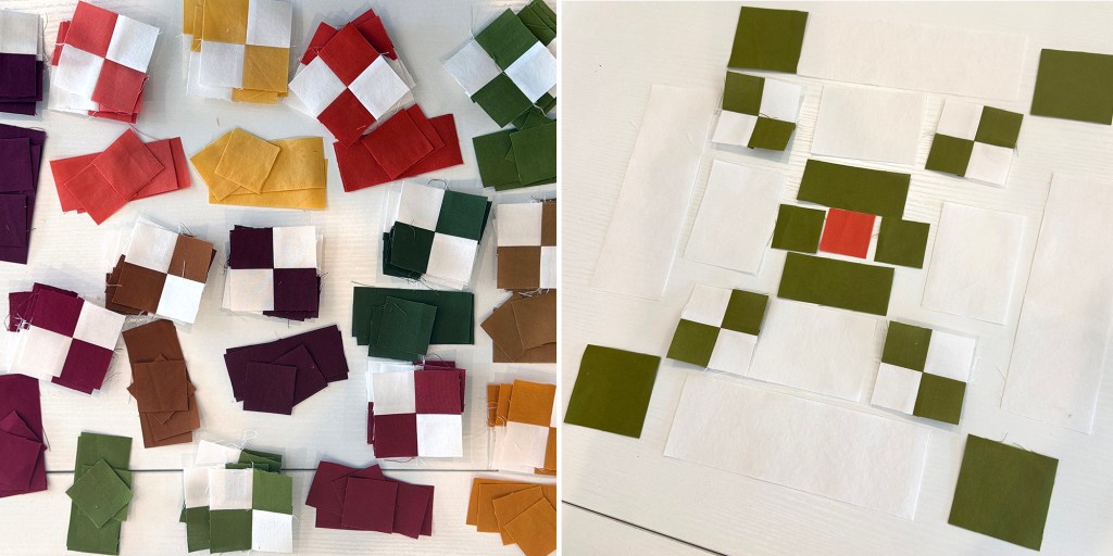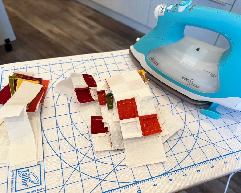 Keep all similar colors together so it’s easier to create each chain block or border unit. I’m pressing all of my seams open and sewing with a shorter stitch length so my small pieces will lie flat as everything goes together. I’ll work on the border blocks first, since those are smaller and it’s nice to get them out of the way.