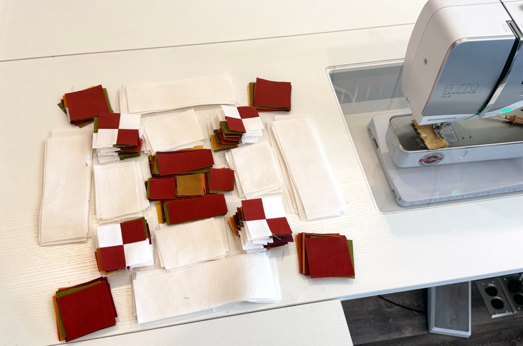 Once the 4 patches are sewn, they can be treated as a single unit when sewing the rows together in each block. I’ll stack all of the same units on top of each other so I can sew a whole bunch at once.