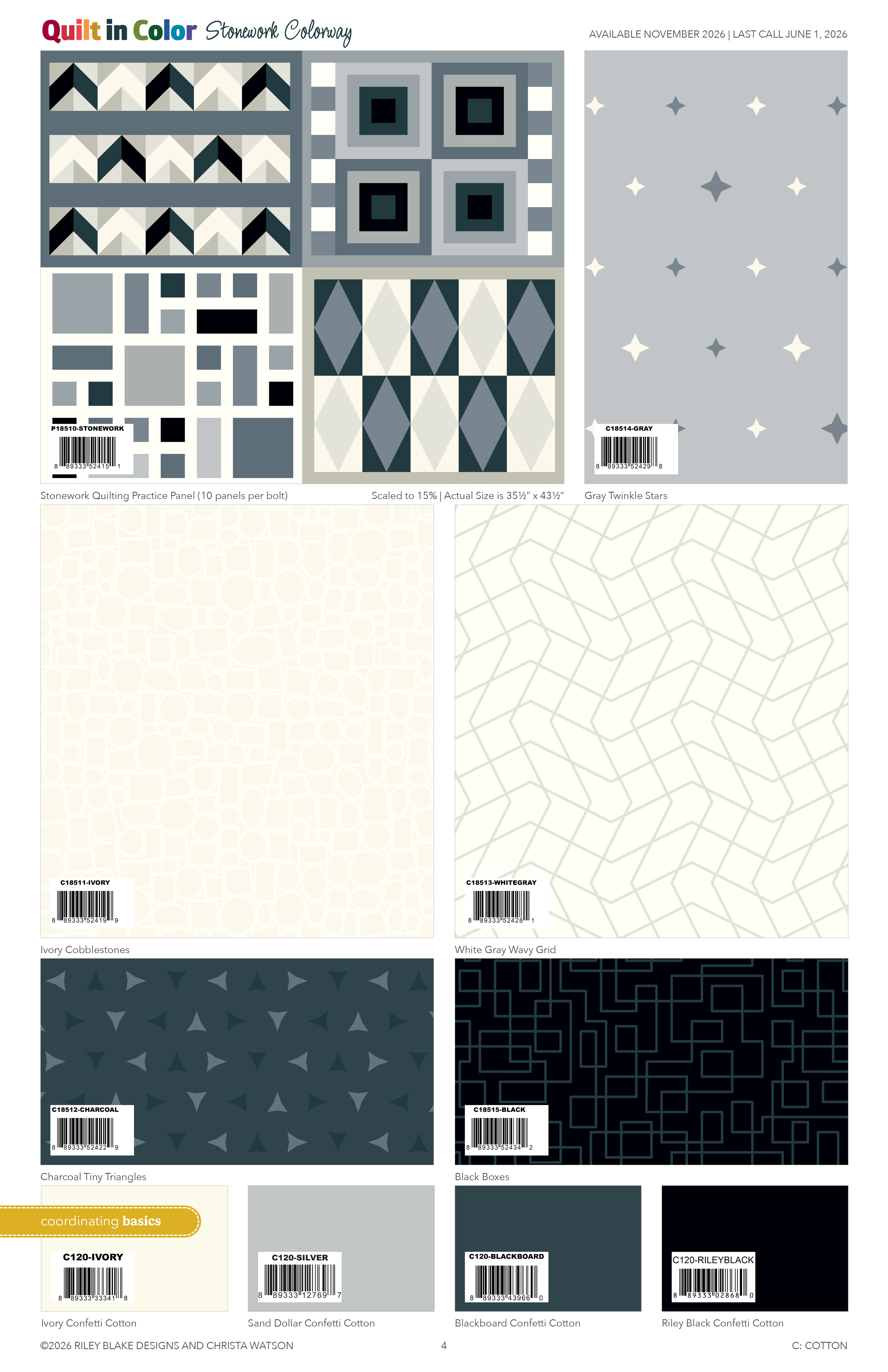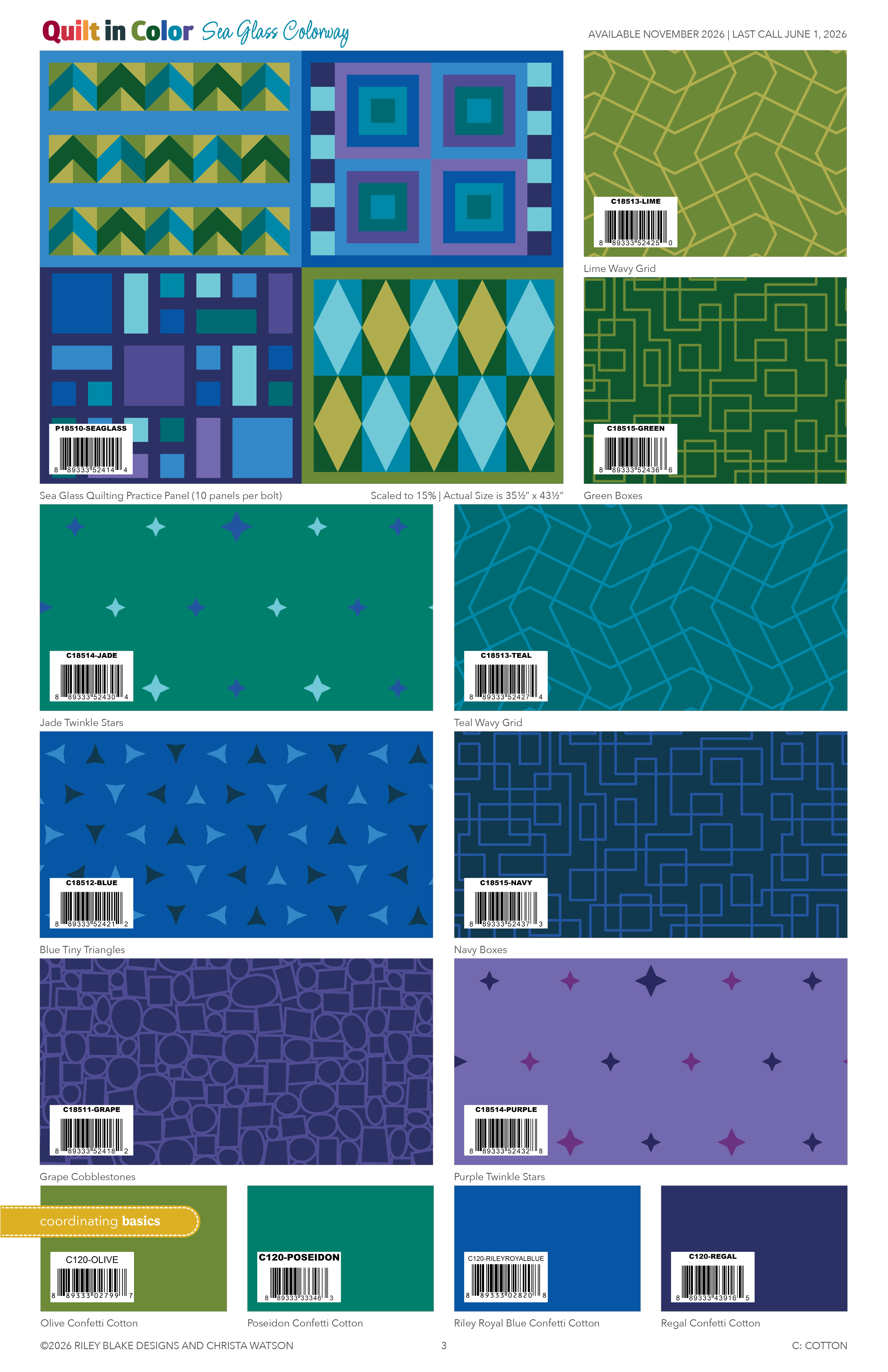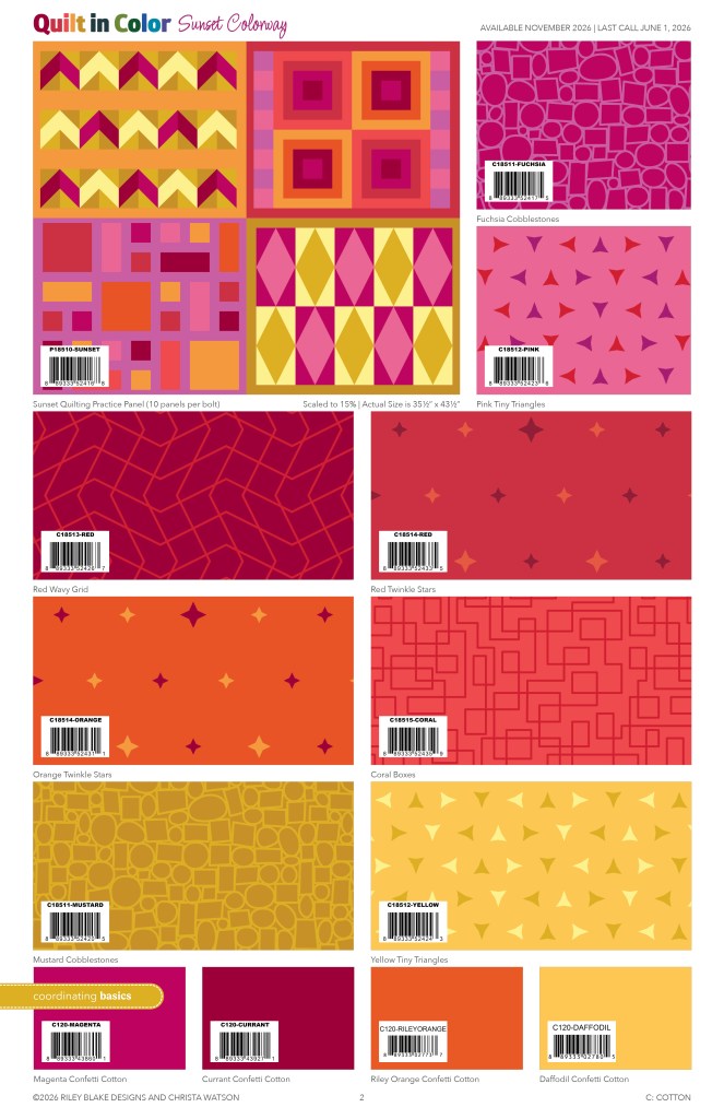 I’m so excited about my debut fabric line with Riley Blake called Quilt in Color. Now you may be wondering why I switched fabric companies? Simply put, it was time for me to stretch my wings and grow. In all of my previous 10 fabric collections, I had help with the technical aspects of design. But this one is ALL me and I couldn’t be more proud! Take a look at the color cards below: