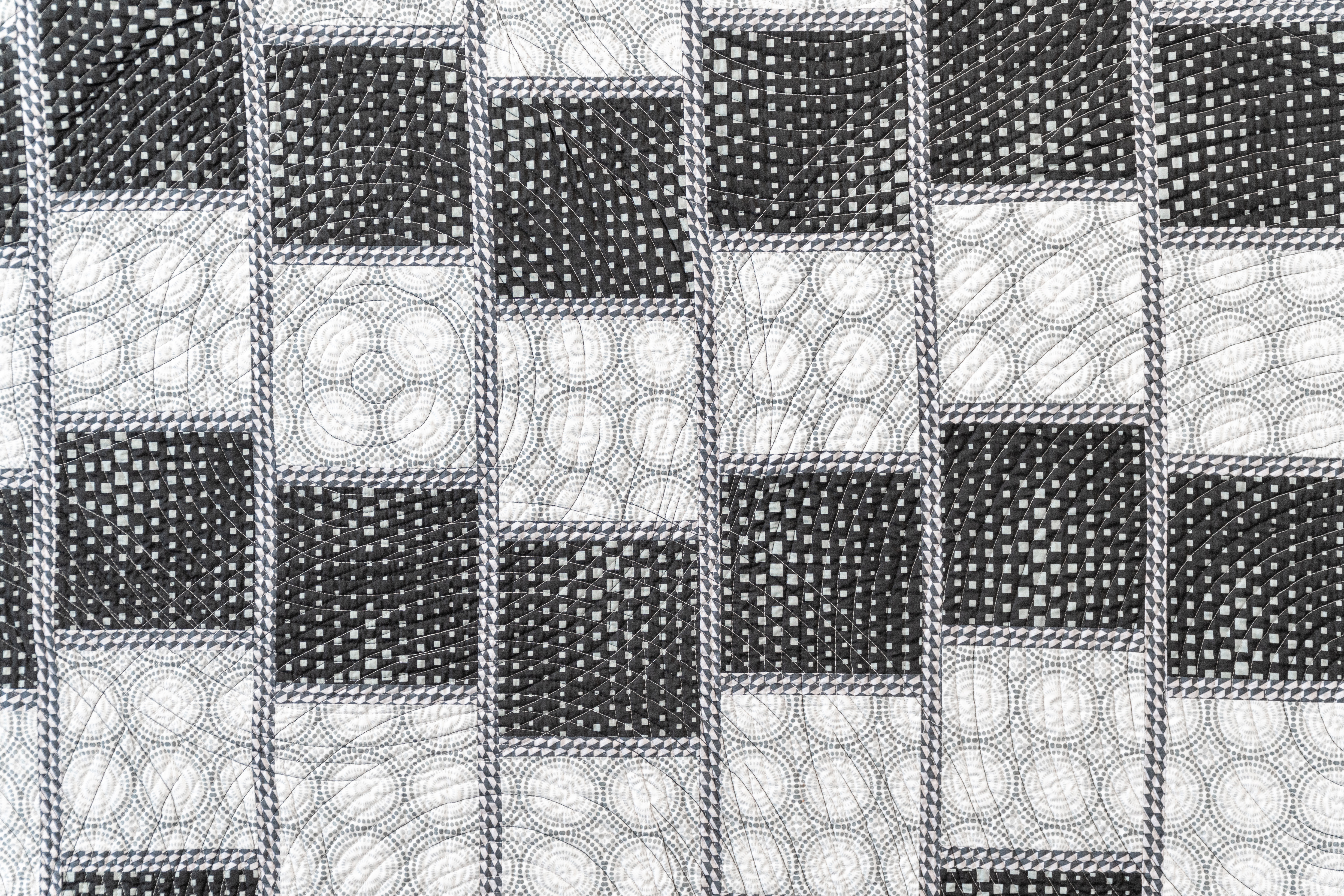 Here’s a detail shot showing off the custom quilting of the colorful version of Interlinked. And since I’m using gray thread on busy gray fabric, you can see how it blends in and you can hardly notice any mistakes. Instead, you can only see the delicious texture!