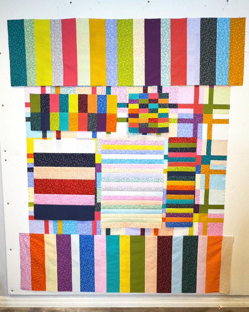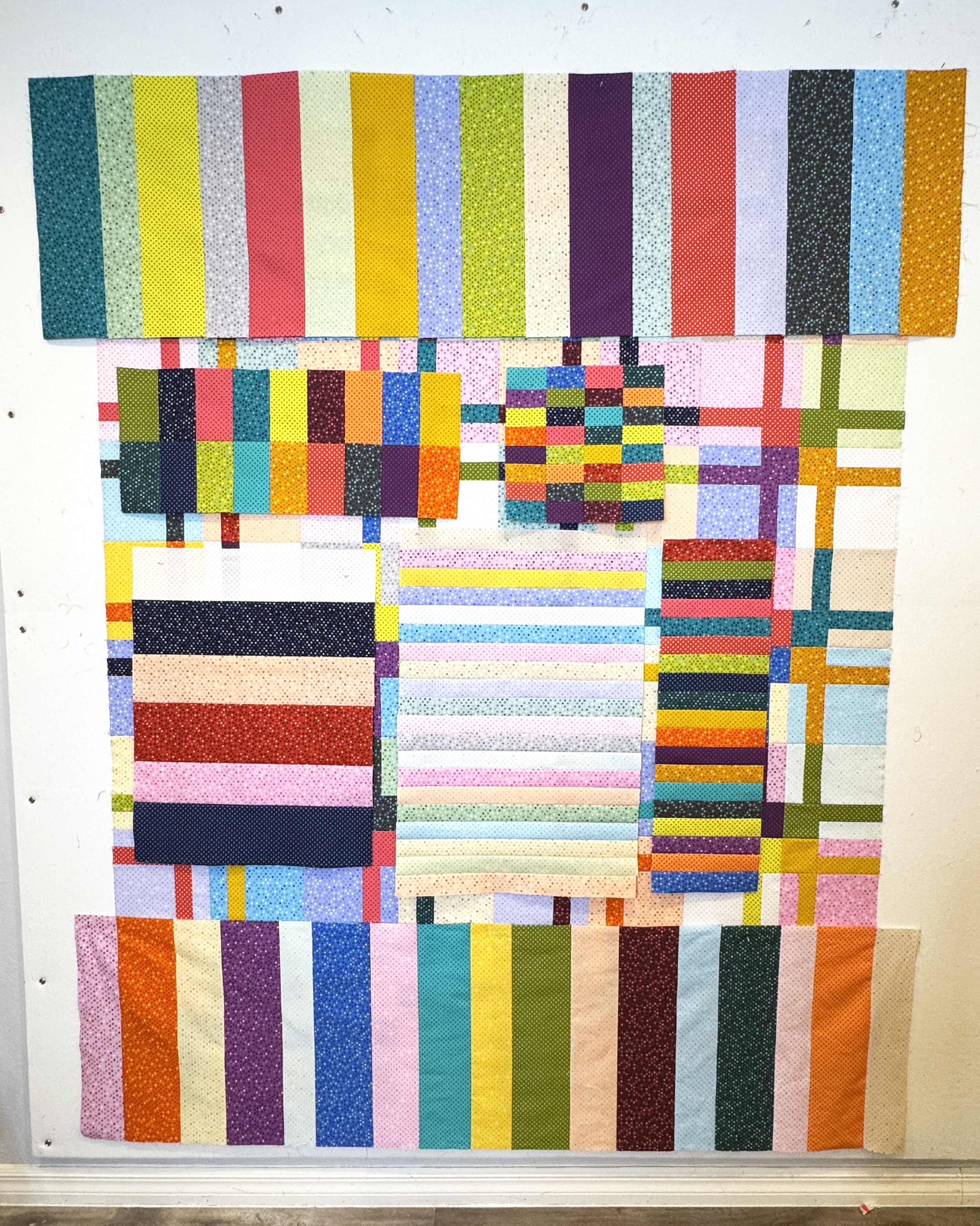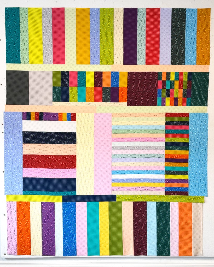 Whenever I have leftovers, I start by grouping them into similar sizes. Then I randomly sew the same sized units together to make bigger pieced panels. Below, I’ve pinned my quilt top to the design wall and am methodically covering it up with pieced leftover units. I’ll fill in the gaps with other fabrics as needed.