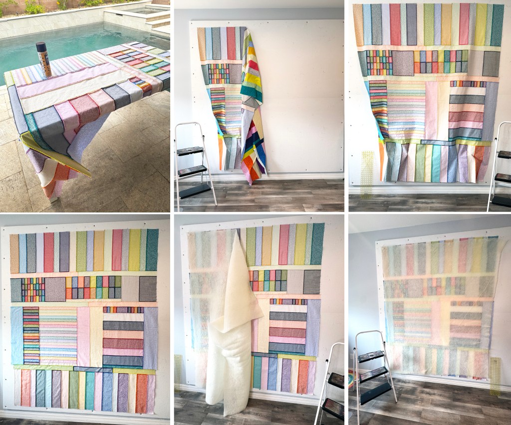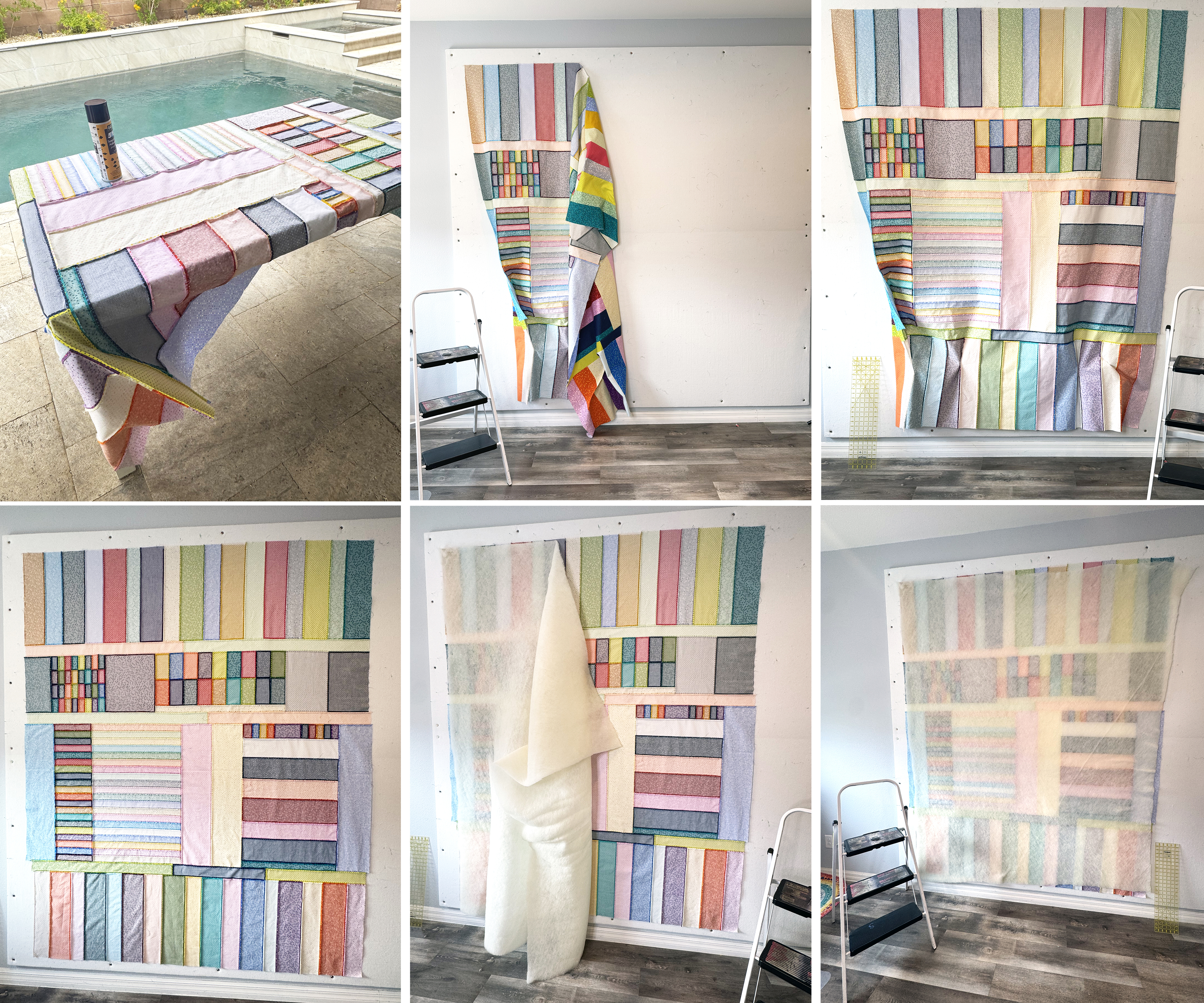 Above: for this quilt, I sprayed the wrong side of the pieced backing and pinned it to my design wall. Gravity pulls on the weight of the quilt and I use a long acrylic ruler to help me smooth out each of the layers. The batting layer is next and I take as much time as I need to make sure it’s all nice and flat. As long as the backing and batting are larger than the quilt top, I’m in good shape.