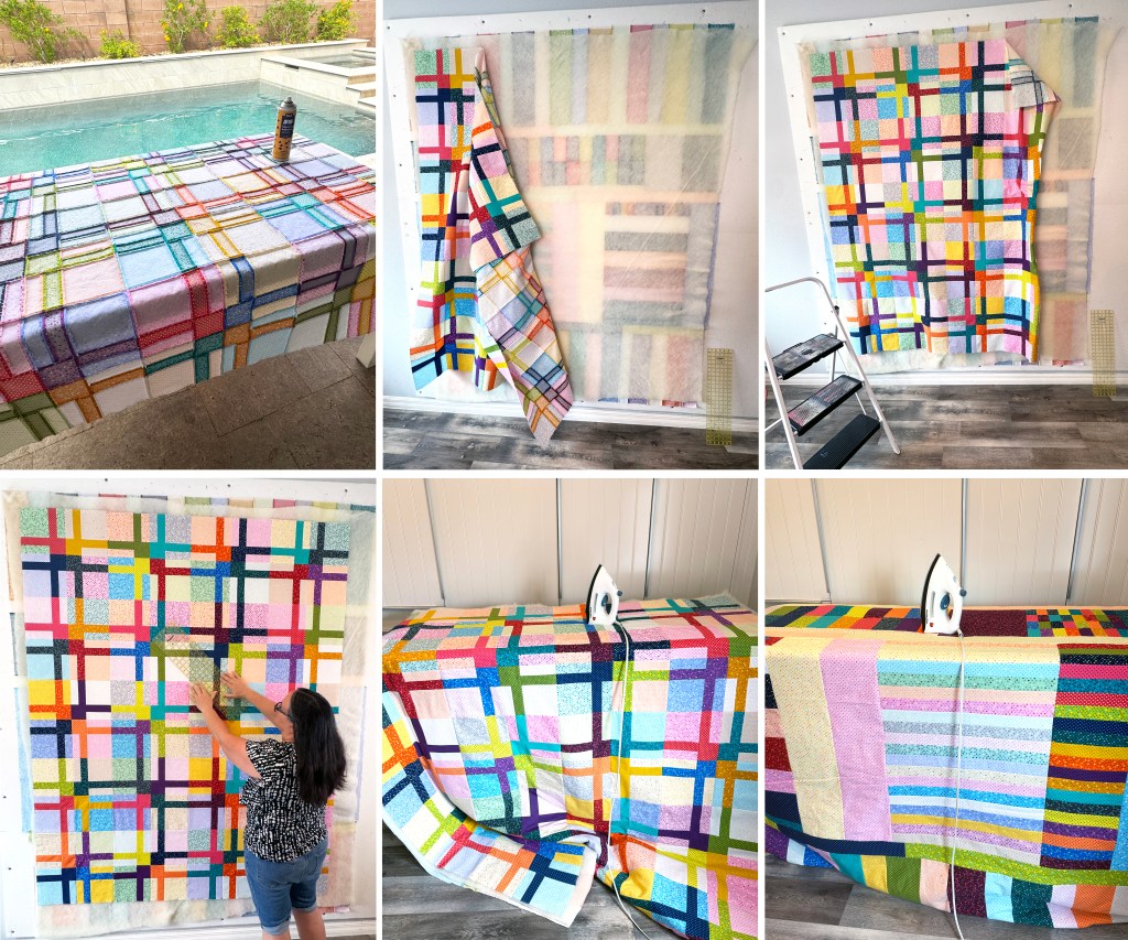 Below: next I sprayed the wrong side of the quilt top and added that as the final layer, smoothing it again with the ruler. I can also smooth the quilt blocks and rows so that the quilt top is flat, smooth and squared up. Finally, I iron both sides of the quilt with a hot, dry iron to set the glue. It also gives me a chance to press out any wrinkles and smoosh all the layers together. Every inch of the quilt is sticking to itself which makes machine quilting a breeze. And there’s no pesky pins getting in my way!