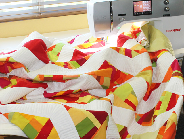 I know that all of that negative space can be a bit intimidating to quilt, but here’s my tip: choose an interesting free-motion design. and meander your way around the blocks to add some texture to the quilt.