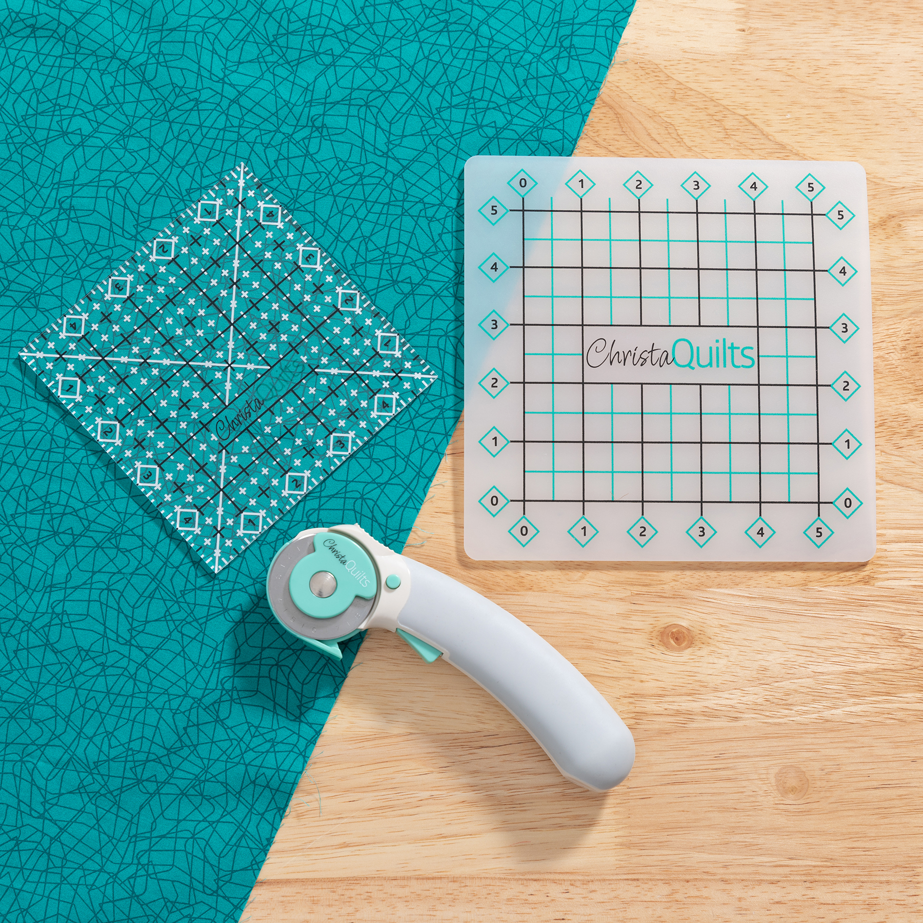 My rotary cutter pairs nicely with my mini mat and ruler set. This handy pair is perfect to keep right by your machine to make small cuts without having to get up from your workspace. I also use it to trim off binding ends when sewing my binding to a quilt.