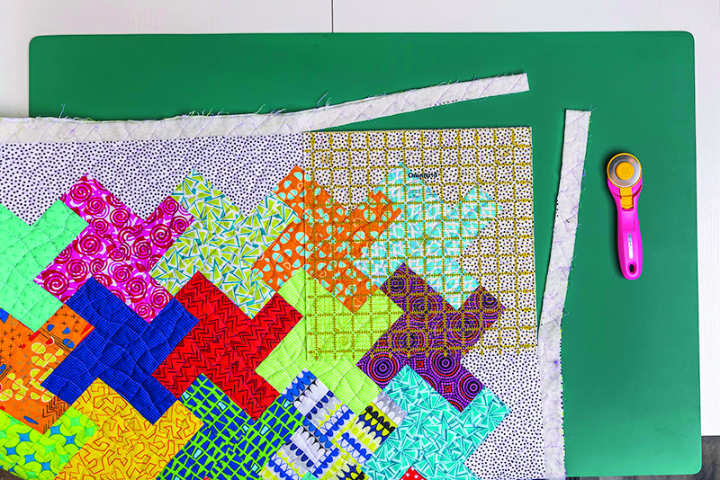 Trim off the excess fabric and batting so that the edges are straight and flush. I prefer to use a large square ruler to trim the corners of the quilt, and long straight rulers to trim the edges.